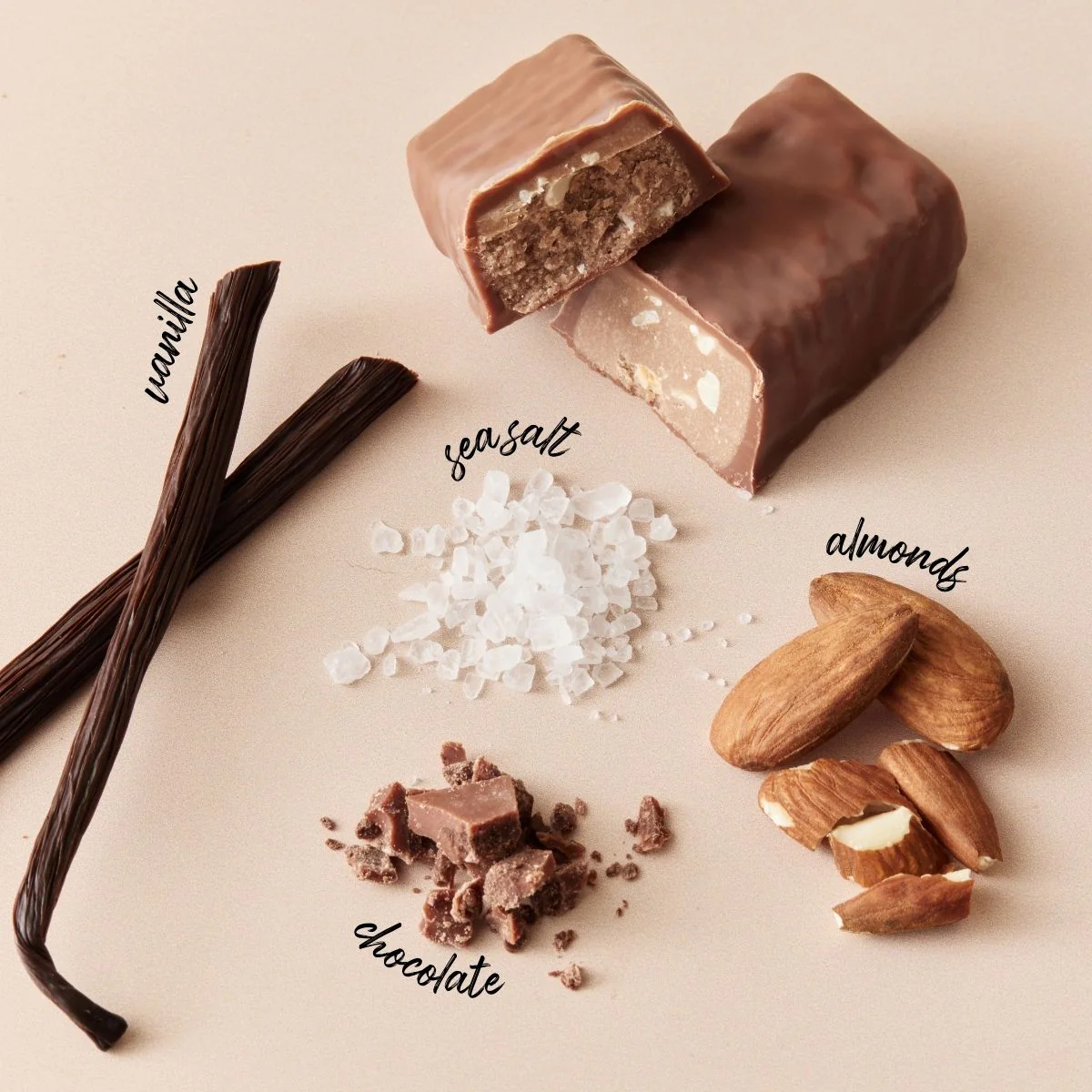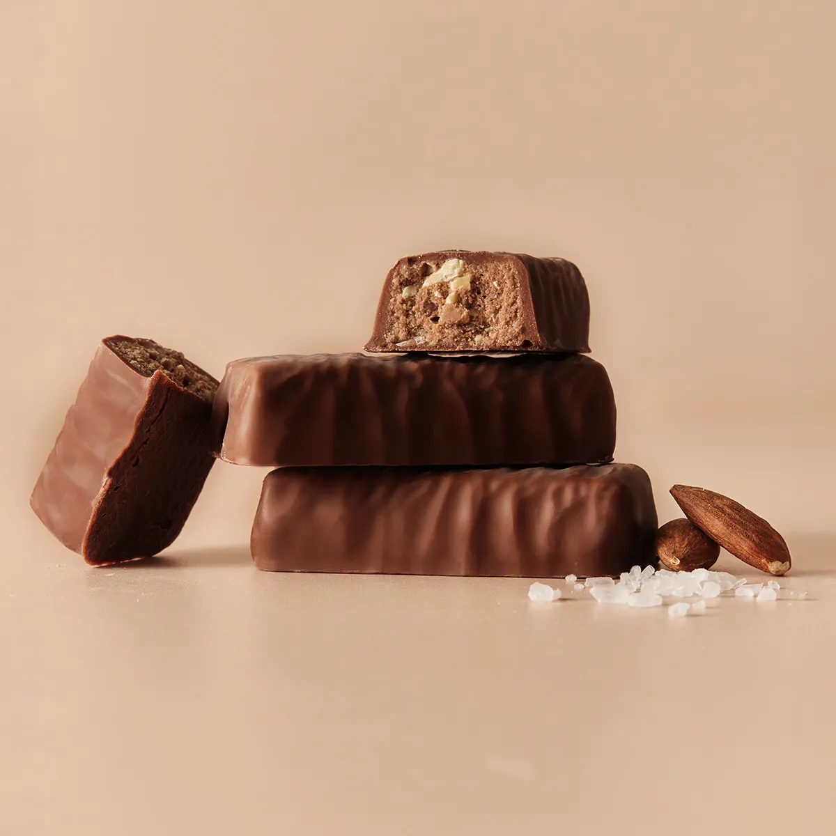 Notre barre suisse végane aux amandes et au sel de mer est fourrée d'un onctueux beurre d'amandes et de morceaux d'amandes croquants, puis trempée dans un chocolat au lait soyeux et agrémentée d'une pincée de sel de mer ; l'équilibre parfait entre le sucré et le salé.